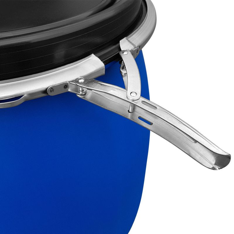 120 literes széles nyakú, műanyag fedeles hordó, szorítógyűrűvel, kék, UN tanúsítvánnyal