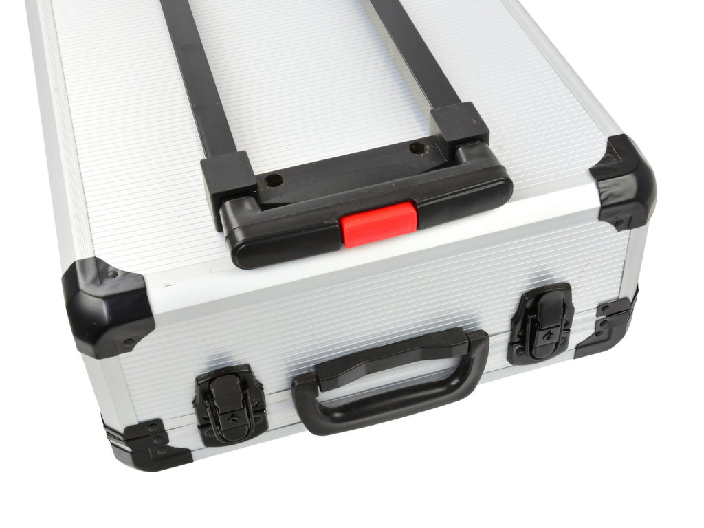 Masszív, könnyű alumínium szerszámos koffer, amely ideális különféle szerszámok biztonságos tárolására és szállítására. Kerekes kivitelének és kihúzható fogantyújának köszönhetően egyszerűen mozgatható.