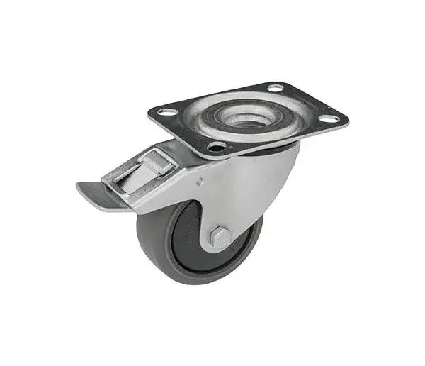 Antisztatikus forgó-fékes horganyzott villába szerelt NYOMMENTES tömörgumi kerék, csavarozott tengely, golyóscsapágy, talplemezes felfogatás