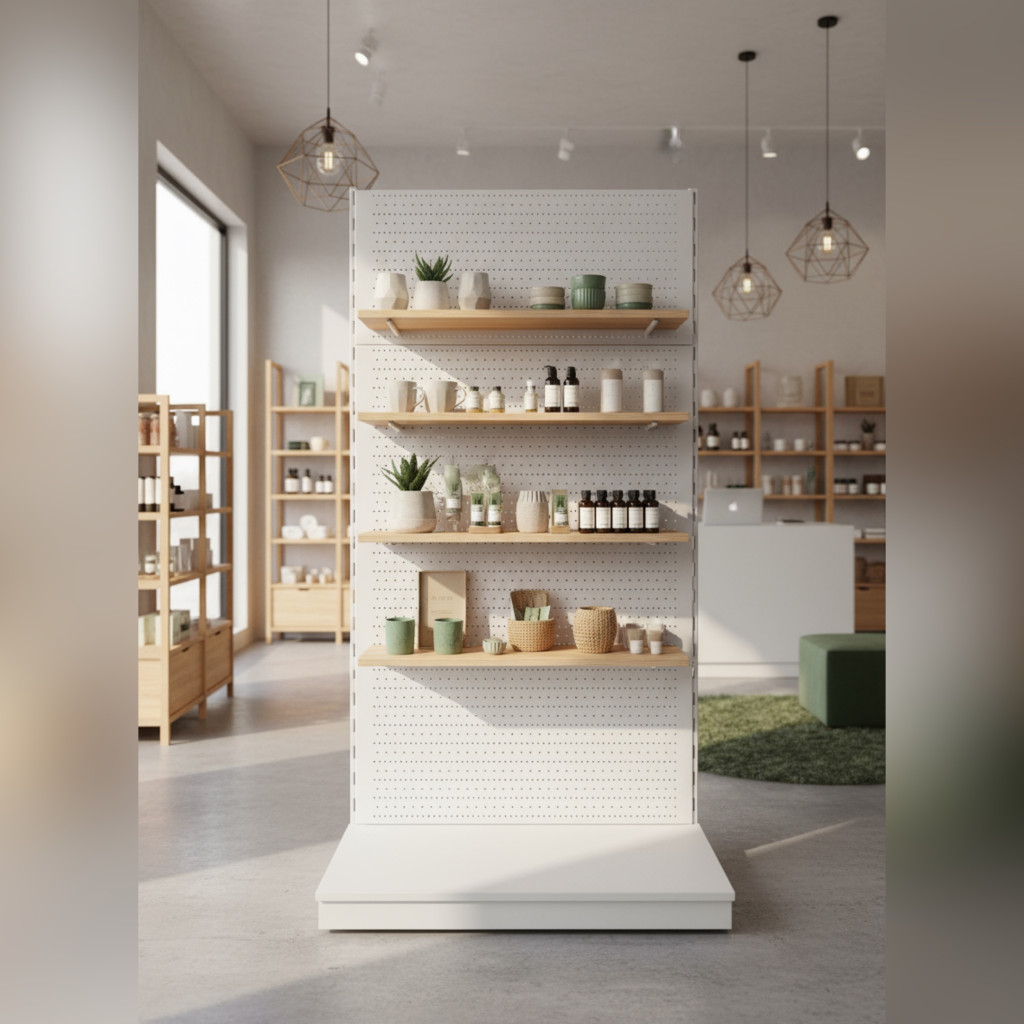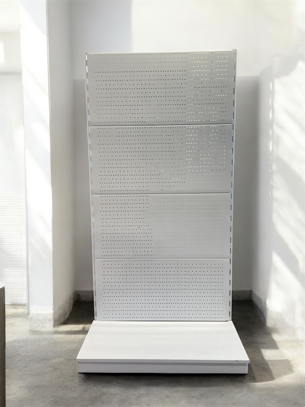 Egyszerűen összerakható, praktikus, fehér porszórt fém bemutató állvány.