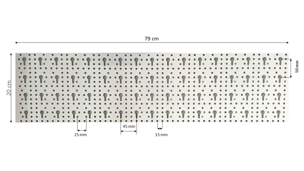 Méret: bruttó szé x ma: 800x200 mm ( a perforált lemez szélessége a szimpla falsínekkel együtt értendő, a panel ennél a méretnél keskenyebb (790 mm))