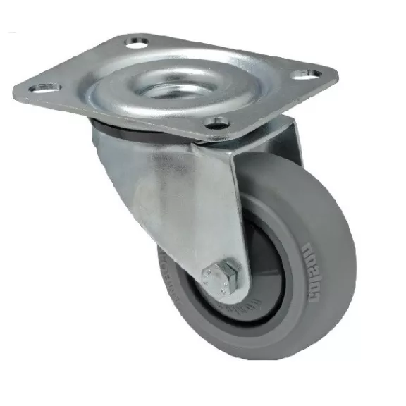 Forgó görgő, Préselt acéllemez villaszerkezet, csavarozott tengely, polipropilén keréktárcsa, szürke, nyommentes PERFORMA gumi futófelület, Golyóscsapágy, talpas felfogatás