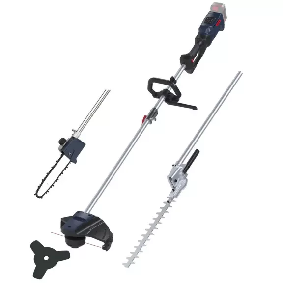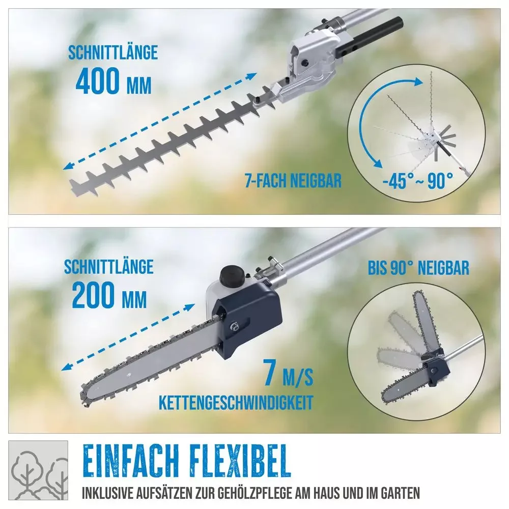 A sövénynyíró feltét 400 mm-es vágási hosszal rendelkezik, feje pedig -45° és +90° között állítható, így a különböző magasságban és szögben lévő sövények formázása is egyszerűbbé válik. Az ágvágó láncfűrész feltét 200 mm-es vágási hosszt kínál, 0 és 90° között dönthető fejjel, valamint 7 m/s láncsebességgel, így alkalmas kisebb ágak levágására és a magasabban elhelyezkedő részek elérésére is.