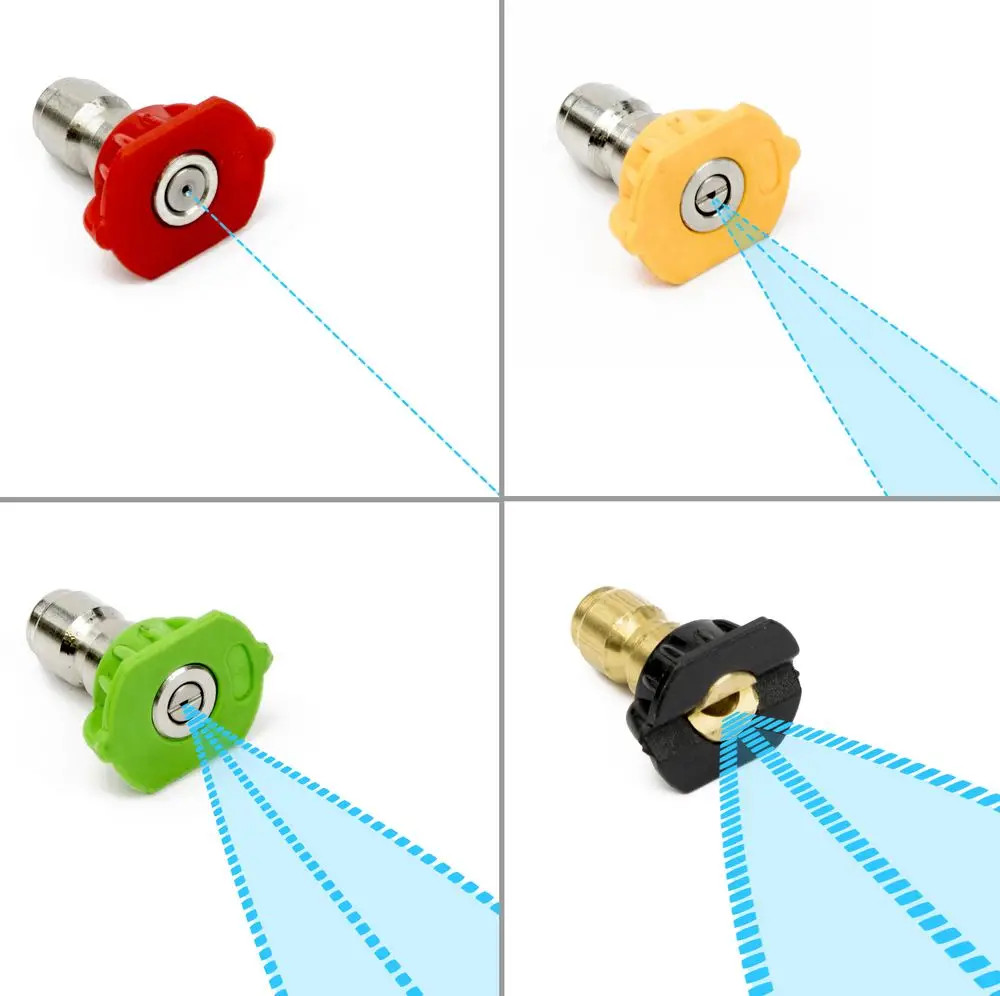 magasnyomású tisztító, 6 m magasnyomású tömlő praktikus tömlődobon, magasnyomású pisztoly 4 fúvókával (0° / 15° / 25° és széles), szennyeződéseltávolító, háromszögletű kefe, forgó körkefe és felülettisztító.