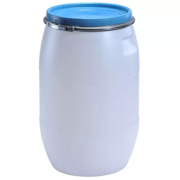 Csattal ellátott műanyag hordó, amely alkalmas laza anyagok, folyadékok szállítására és tárolására. A levehető fedelet egy fémgyűrűvel és kupakkal biztonságosan rögzíti a helyén.