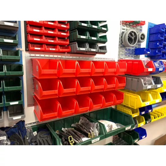 Nagy teherbírású vízszintesen réselt, horganyzott fém lemez, piros MH4 dobozokkal.