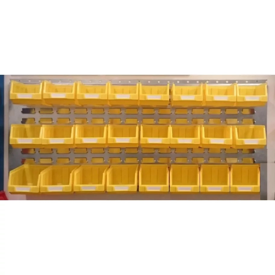 Nagy teherbírású réselt, fém lemez, hátoldalán két függőleges merevítéssel, BULL2 Sárga dobozokkal.