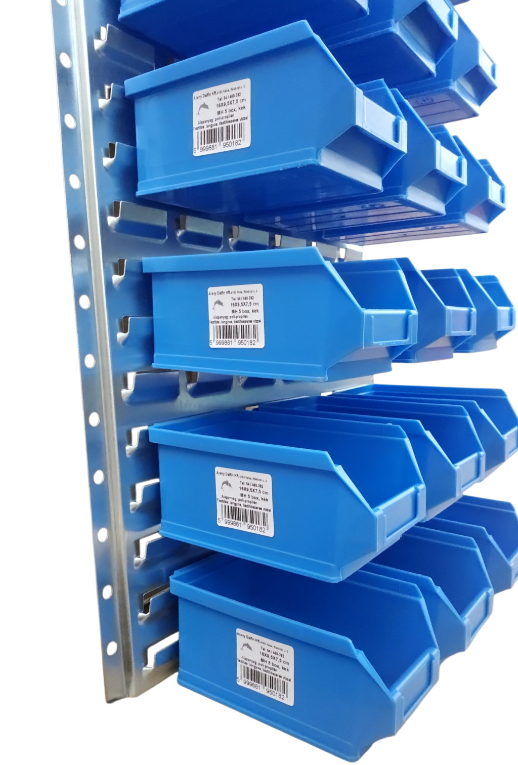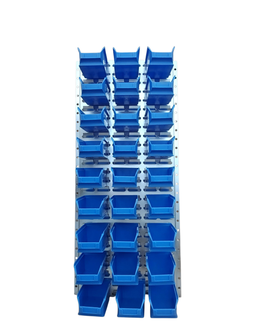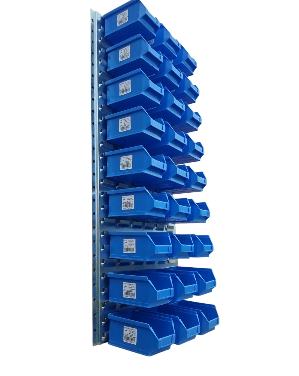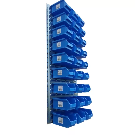 Nagy teherbírású függőlegesen réselt, horganyzott fém lemez kék MH5 dobozokkal