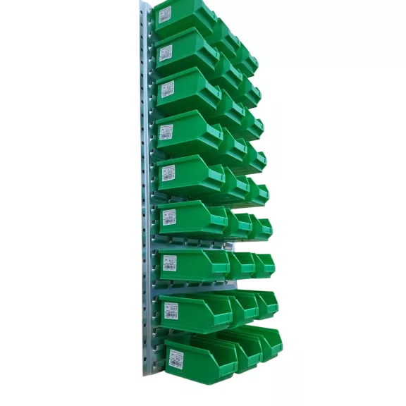 Nagy teherbírású függőlegesen réselt, horganyzott fém lemez zöld MH5 dobozokkal.