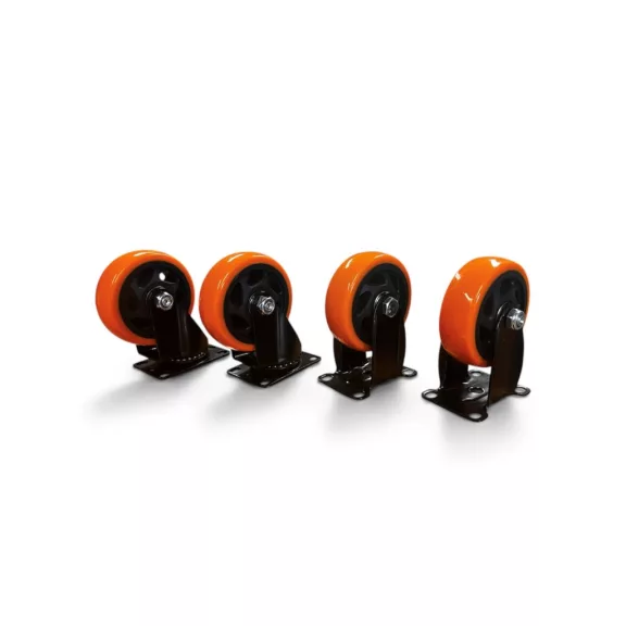 Golyóscsapágyas, Polipropilén futófelülettel, acélfelnis kerék, talplemezes rögzítéssel, 2 db önbeálló villában + 2db fix villában