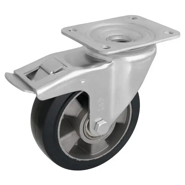 Közepes teherbírású, elasztikus gumi, talpas, forgó-fékes görgő, 200 mm