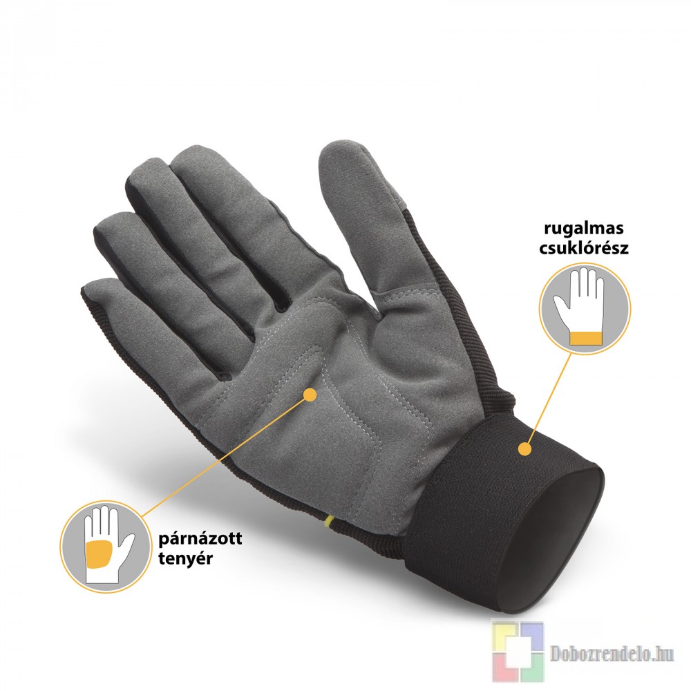 Kiváló fogásbiztonságot nyújtó kesztyű profiknak. Párnázott tenyérrész, megerősített varrásokkal és lélegző ujjkialakítással.