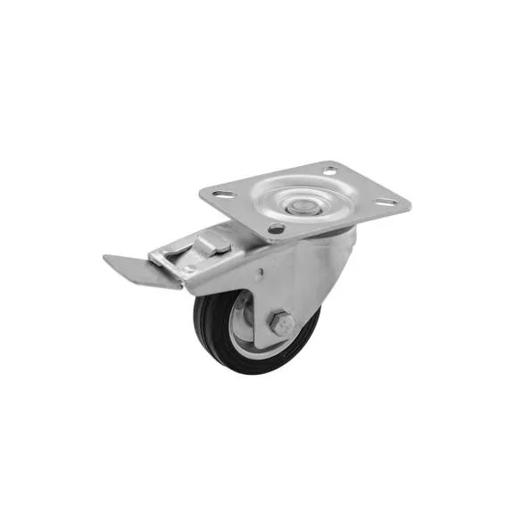 Gördülőcsapágyas, tömör gumi műszerkocsi kerék talplemezes rögzítéssel, forgóvillával, fékkel.