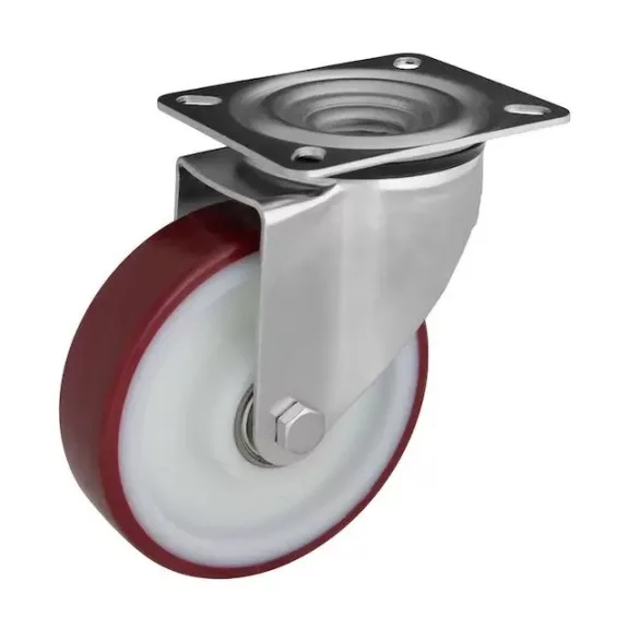 Poliuretán futófelülettel, talplemezes-önbeálló, horganyzott villába szerelve, 200 mm, 400 kg teherbírás