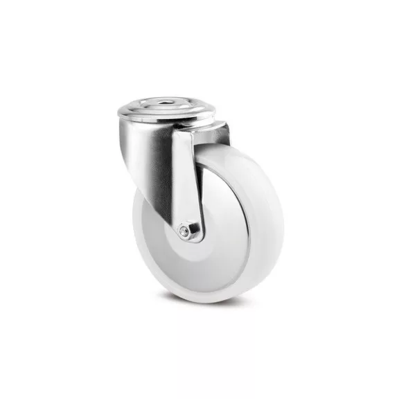 Önbeálló görgő, Préselt acéllemez villaszerkezet, cinkkromátozott, dupla golyósoros csapágy a nyakban, csavarozott tengely, csavarfurat. Poliamid kerék, szálvédő, siklócsapágy.