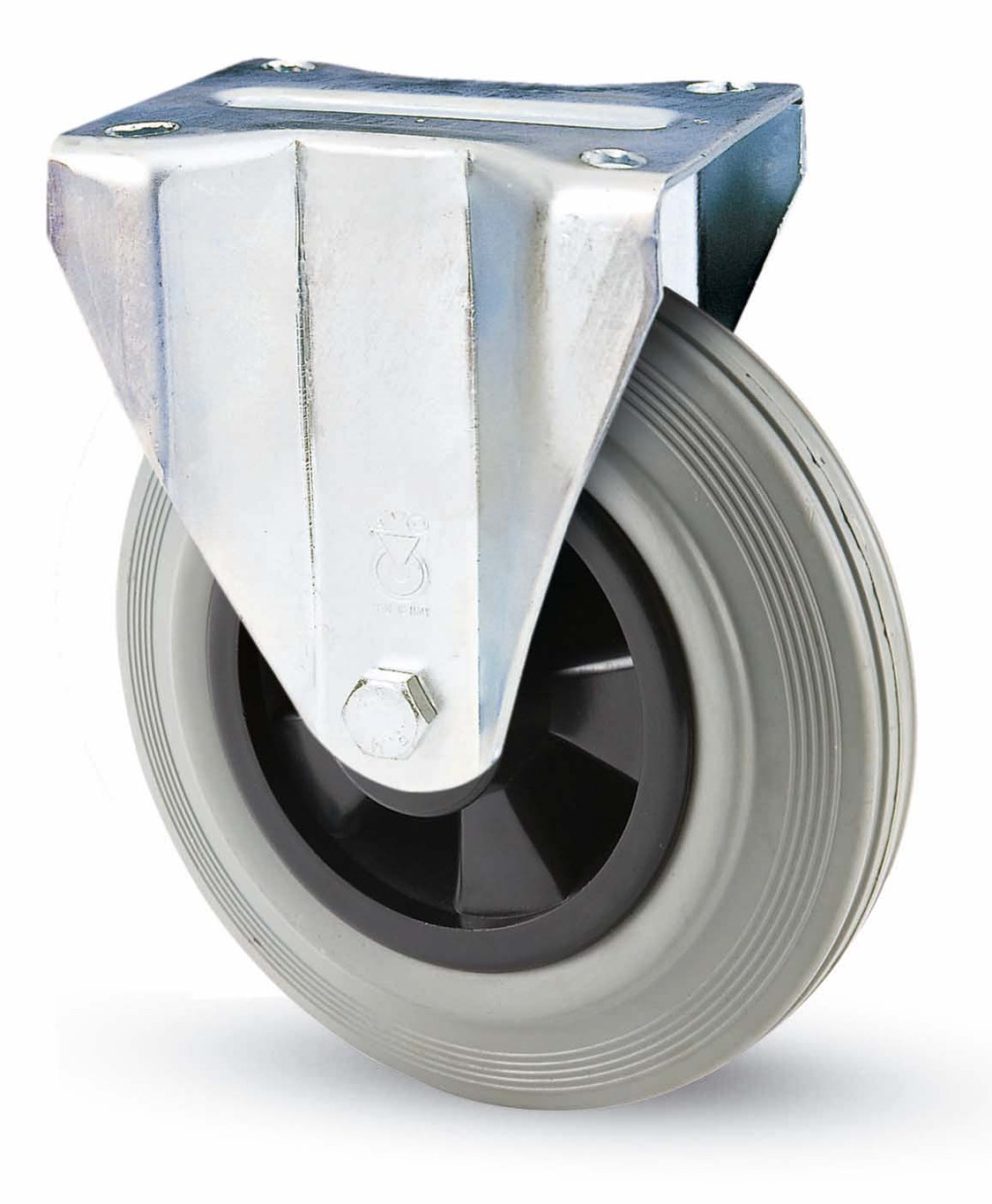 Talplemezes, fix, préselt acéllemez villaszerkezet, csavarozott tengely. Szürke (nyommentes) tömörgumi futófelület, siklócsapágy.