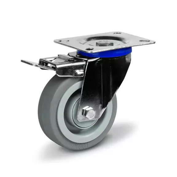 Termoplasztikus gumi futófelületű, forgó-fékes talpas görgő, inox villában, 100mm