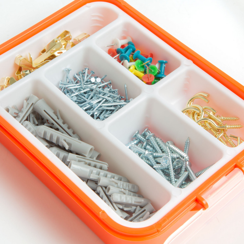 Minden háztartásban szükség van általános barkács termékekre. Ez a készlet a rögzítési folyamat elengedhetetlen kellékeit tartalmazza, többek között tiplik, csavarok, kampók, szegek, térképtűk képezik az átlátszó tetejű doboz beltartalmát.