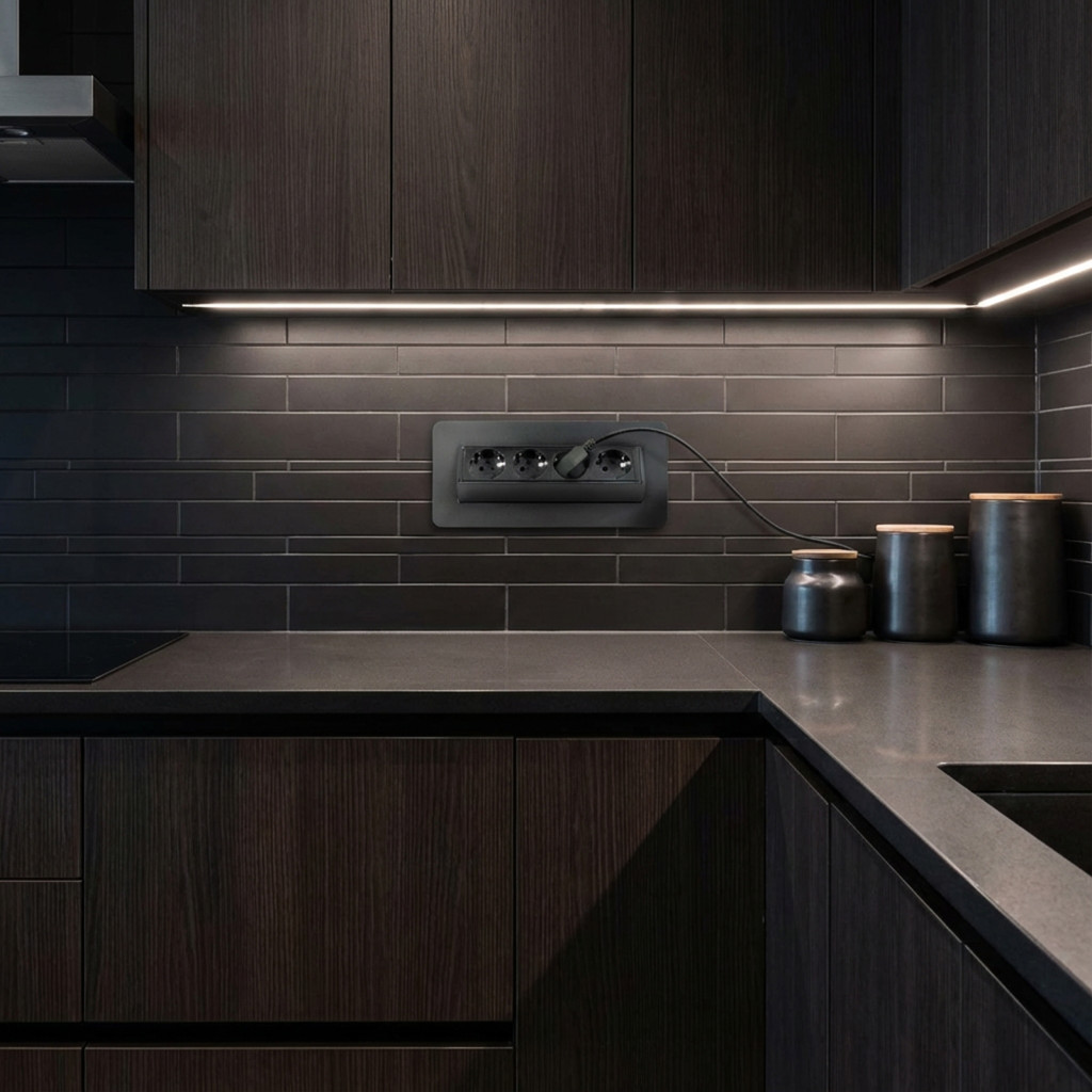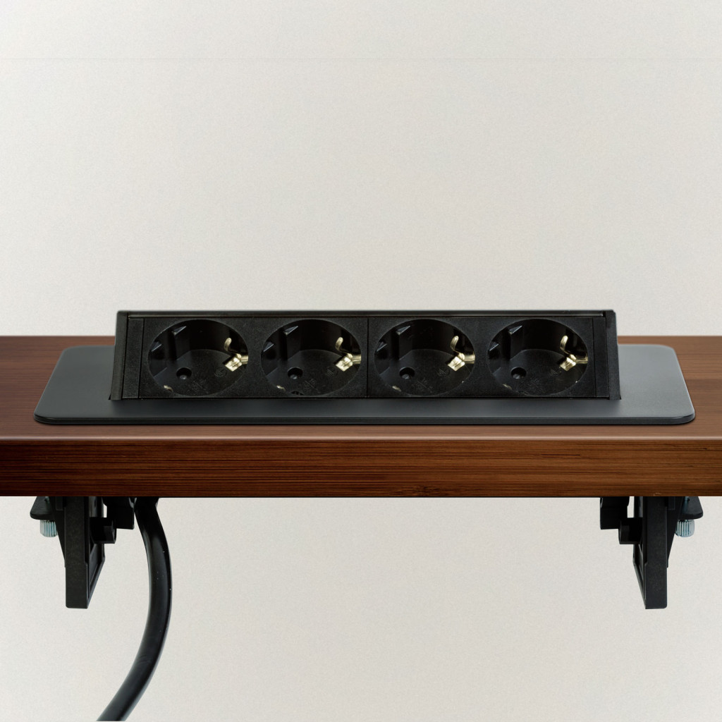 Süllyeszthető elosztó irodai és otthoni felhasználásra, matt fekete felülettel, 4 db gyermekvédelemmel ellátott aljzattal. Asztala, bútora legyen mindig elegáns és rendezett, mégis funkcionális. A rejtett elosztó kiváló megoldás lehet ha már például kész konyhával rendelkezik, de nincs elegendő konnektor a kívánt helyen. Ilyenkor falvésés és villamos hálózat bővítés nélkül, remek alternatíva lehet egy rejtett elosztó. Egy mozdulat és máris rendelkezésre áll 4 szabad konnektor. Ideális lehet olyan elektromos eszközökhöz, amit nem folyamatosan használunk, kenyérpirító, vízforraló... Ha használaton kívül vannak, az "flip-up" elosztó egy mozdulattal elrejthető, ezzel is megkönnyítve például a takarítást, valamint rendezett, letisztult külsőt ad a helységnek.