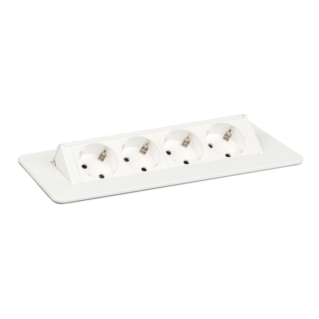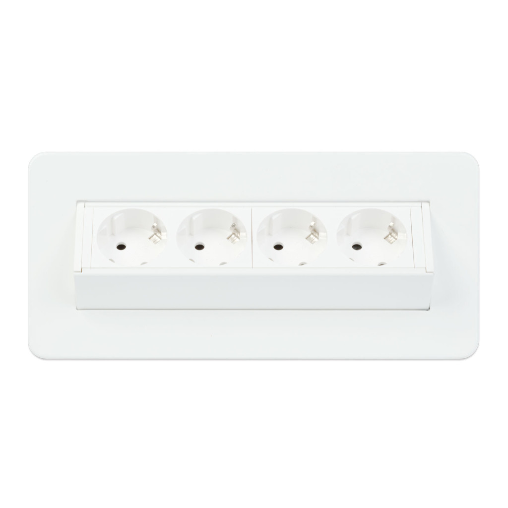 Süllyeszthető elosztó irodai és otthoni felhasználásra, matt fehér felülettel, 4 db gyermekvédelemmel ellátott aljzattal. Asztala, bútora legyen mindig elegáns és rendezett, mégis funkcionális. A rejtett elosztó kiváló megoldás lehet ha már például kész konyhával rendelkezik, de nincs elegendő konnektor a kívánt helyen. Ilyenkor falvésés és villamos hálózat bővítés nélkül, remek alternatíva lehet egy rejtett elosztó. Egy mozdulat és máris rendelkezésre áll 4 szabad konnektor. Ideális lehet olyan elektromos eszközökhöz, amit nem folyamatosan használunk, kenyérpirító, vízforraló... Ha használaton kívül vannak, az "flip-up" elosztó egy mozdulattal elrejthető, ezzel is megkönnyítve például a takarítást, valamint rendezett, letisztult külsőt ad a helységnek.