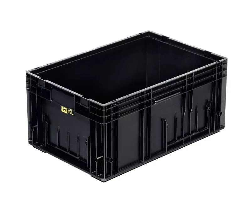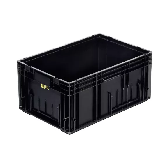 A könnyített, ugyanakkor megerősített konstrukció stabilitást és jó kezelhetőséget kínál intenzív napi használat mellett is. A zárt, kagylós markolat ergonomikus és biztonságos kézi mozgatást tesz lehetővé. A fekete színű kivitel mindkét rövid oldalon, a markolat alatt elhelyezett sárga RL ESD jelöléssel van ellátva, amely egyértelmű azonosítást biztosít elektrosztatikusan érzékeny ipari környezetben.