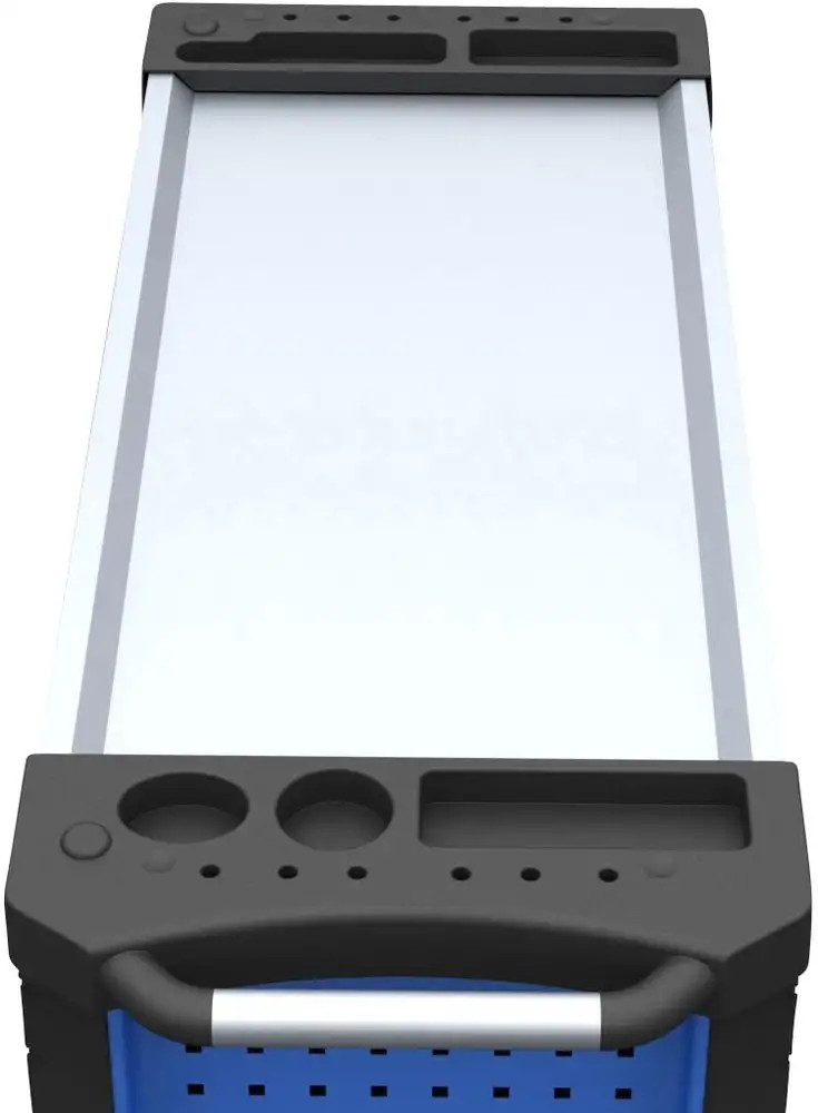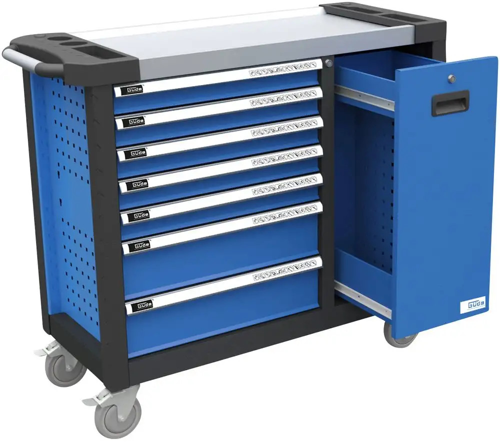 A rendszerezettséget a feliratozható fogantyúsínek is segítik, így mindenki azonnal megtalálja, amit keres. A nagyméretű, rozsdamentes acél munkafelület különösen stabil és ellenálló, biztonságos rekeszeket kínál az apró alkatrészek számára, és mindez együtt teszi a GWPV 7/1 műhelykocsit tökéletes társává bármely műhelyben.
