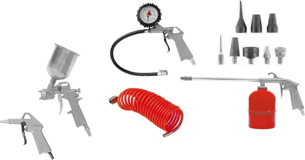 - Sűrített levegős szerszámkészlet 5 darab (áramlási csészés festékszóró pisztoly, gumiabroncs töltő, alumínium áramlási csésze, acéllemez tartályos szórópisztoly és 5 m spiráltömlő, kifúvópisztoly)