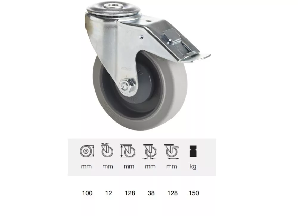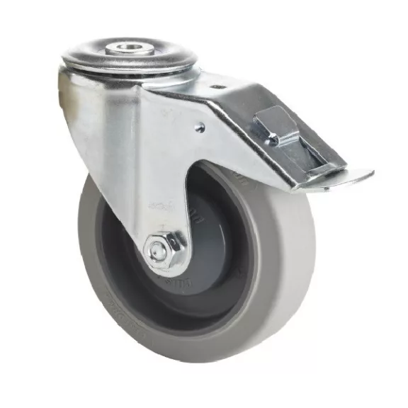 Forgó-fékes görgő, Rozsdamentes villaszerkezet, csavarozott tengely, polipropilén keréktárcsa, szürke, nyommentes PERFORMA gumi futófelület, Golyóscsapágy, furatos felfogatás