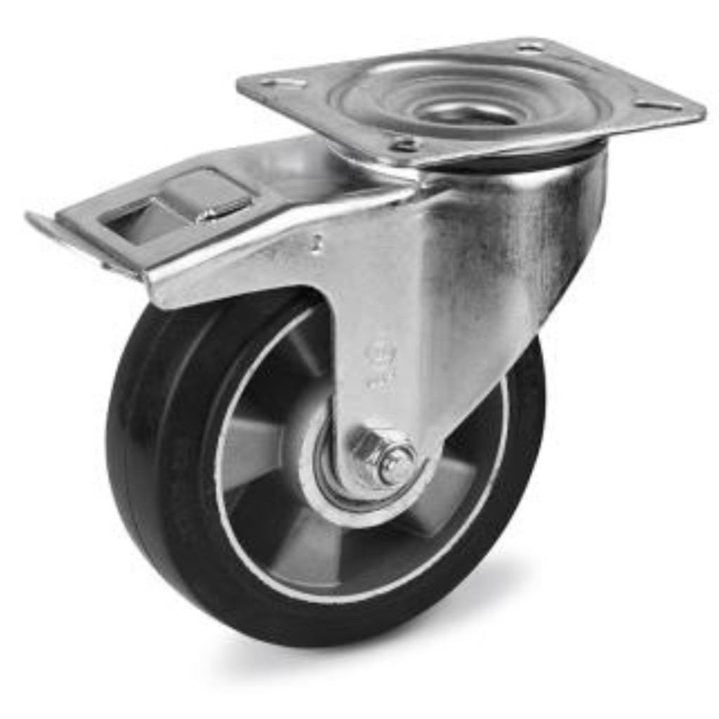 Forgó-fékes kerék, közepes teherbírású ALGE, elasztikus gumi, szerelőlappal, 200 mm