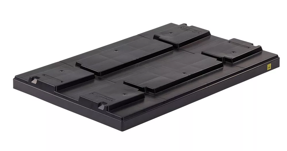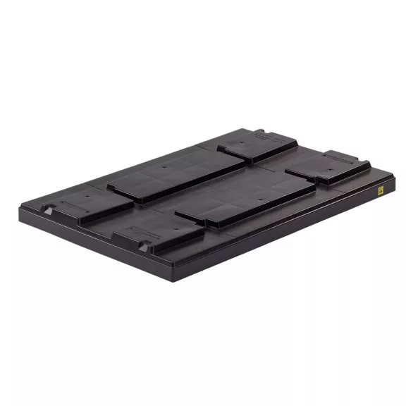A fekete színű fedél két hosszanti oldalán, a külső él jobb oldalán elhelyezett, sárga ESD logóval van ellátva, átlós nyomtatással, amely egyértelműen jelzi az ESD-kompatibilis használatot. A masszív, strapabíró kialakítás hosszú élettartamot biztosít intenzív igénybevétel mellett is. Pontos méretezésének köszönhetően stabilan illeszkedik a szabványos raklapokra, így ideális választás elektronikai, autóipari és ipari logisztikai folyamatokhoz.